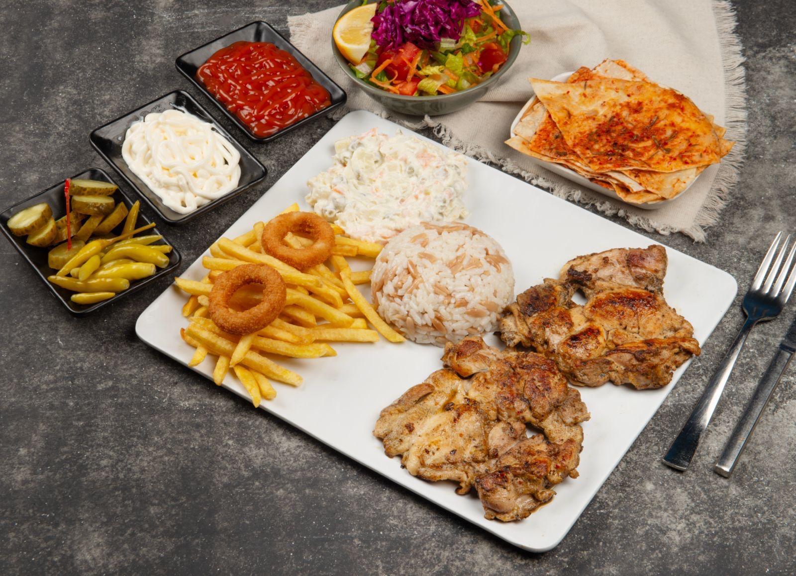 Pilav, Rus Salatası, Mevsim Salatası, Patates Cipsi, Soğan Halkası 2 adet