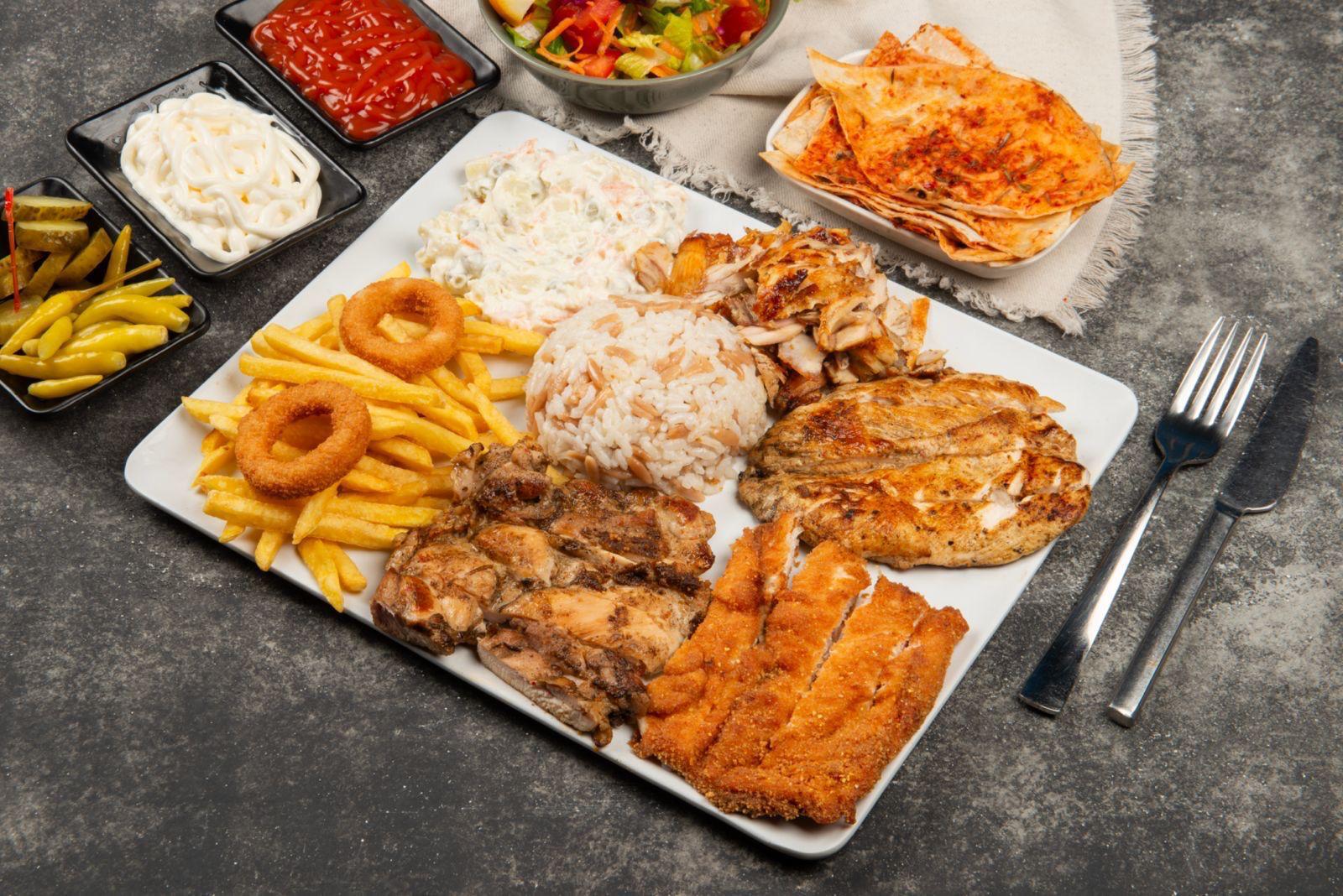 But bonfile, tavuk göğüs bonfile, şnitzel, et döner, tavuk döner, rus